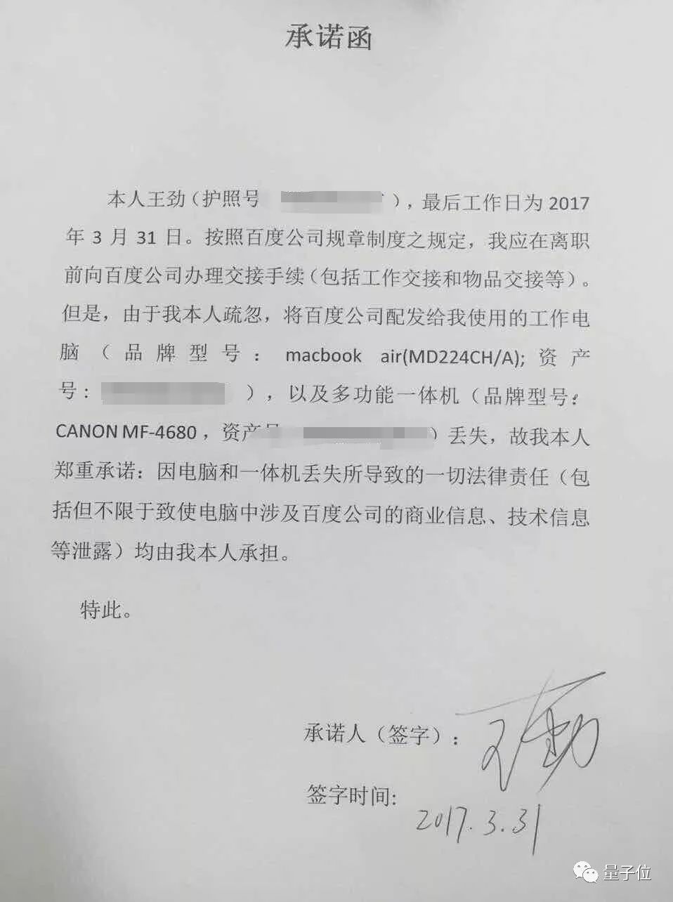 那是一份王劲从百度去职时签订的许诺书,里面明白表白,上述提及的电脑是一部MacBook Air,而打印机则是一部佳能的多功能一体机。