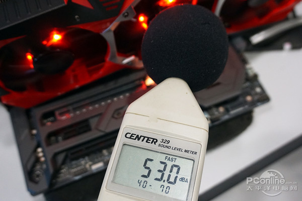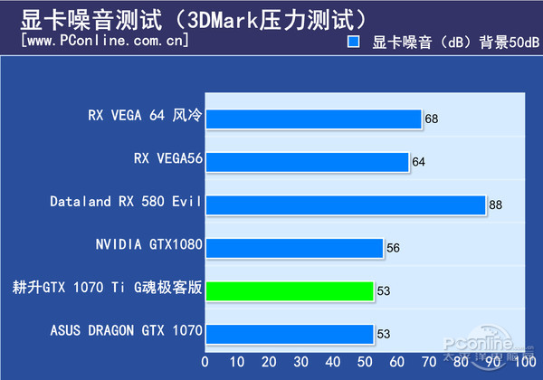 测试小结:耕升GTX 1070 Ti G魂极客显卡的乐音也不高,3DMark拷机时乐音只要53分贝,切近显卡才能听到很是轻细的电扇声,现实监测电扇转速不外1400RPM摆布,运转很是恬静。