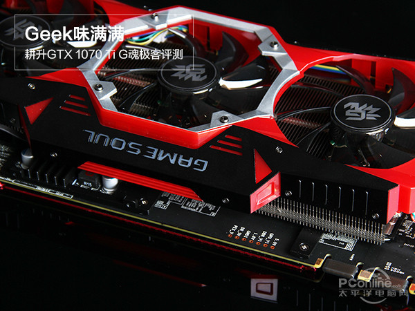 此前我们测过了耕升的GTX 1070 Ti逃风版,那个系列定位收流用户群体,而G魂(Game Soul)系列是耕升针对高端玩家、电竞玩家推出的产物系列,所以外不雅、设想、用料、功能都要更高端一些,GTX 1070 Ti G魂极客版显卡便是如斯。那款显卡利用了三电扇的盖亚Max散热器,概况点缀以红色,后背则是一块带无G魂logo的电镀金属背板,所以全体看起来很是光彩夺目,那类高调的设想气概更容难吸引住心里狂野的高端玩家。