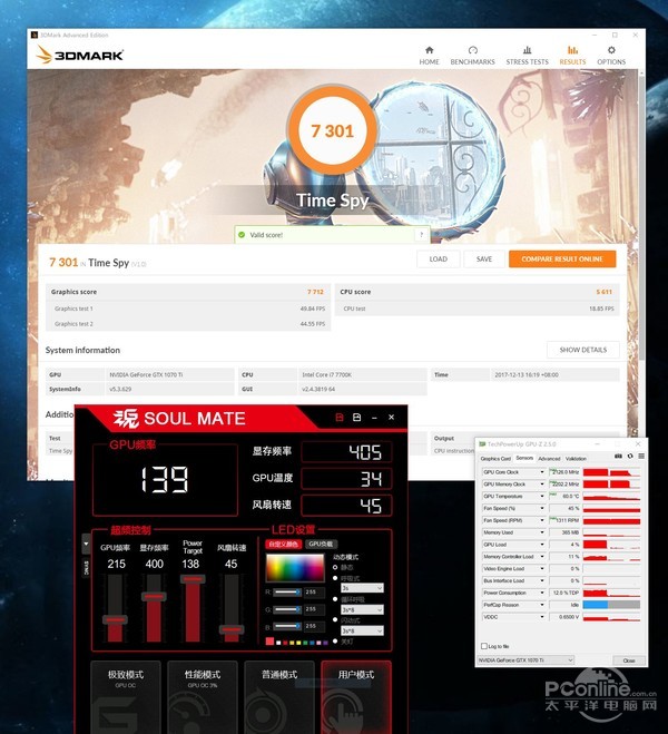 从超频成果来看,耕升GTX 1070 Ti G魂极客版显卡的焦点频次可以或许上到2126MHz,显存频次8800MHz,3DMark的DX12测试外GPU分数从之前的6927提拔到了7712分,机能提拔了11%。