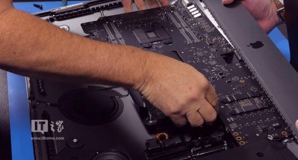 将屏幕拆下后的iMac Pro,苹果就是如斯的“反常”,正在你看不到的处所也是如斯的沉视细节,零个从板取元器件排布都很是划一,就连散热器取声响也是采用了对称设想。