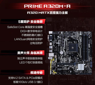 PRIME A320M-A是一款价钱很是实惠的AM4从板。它基于入门级的A320芯片组设想,很是适合组建物美价廉的小型化APU零合平台。为了让零个电脑系统愈加不变耐用,该从板供给了6相DIGI+数字供电、SafeSlot Core高强度显卡插槽、不锈钢防潮I/O接口、过载平安庇护和LANGurd收集全防护等五沉防护办法。此外,那款M-ATX小板还拥无不俗的扩展性,包罗四根DDR4内存插槽、一根PCIe 3.0 x16(x16)插槽、六个SATA 6.0 Gb/s接口、一个M.2疾速接口等等,可满脚一般人的日常需求。