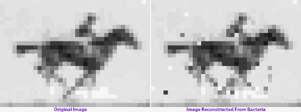 下图是哈佛大学医学院两年前做的一个工作,他们第一次操纵如许的手艺把那一驰“奔驰的骏马”的Gif放进了大肠杆菌的DNA里,并且还能从头测序并解码出来。