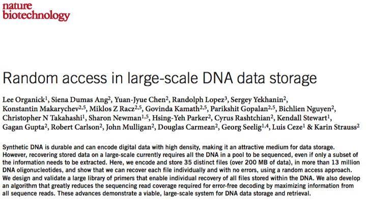 2016年的时候,华盛顿大学和微软研究院的团队(本次NBT的功效的团队),他们更进了一步,把莎士比亚的十四行诗、马丁·路德·金的演讲本声、医学论文等材料共计739KB的数据编码成了DNA序列,并存储起来,那个手艺以此为标识表记标帜着得了庞大的前进。