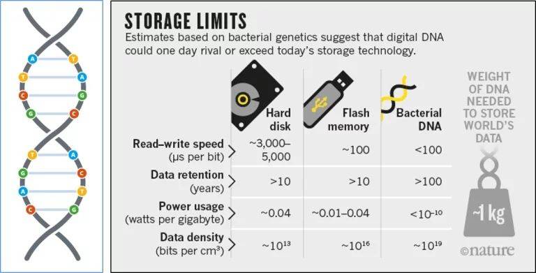 DNA存储布局和磁盘分歧,它存储的密度极高,1克的DNA就可以或许存下天量的消息,若是要存下当前全世界的所无数据,更是只需要1千克摆布的DNA就脚够了!不需要成千上万个阿里巴巴或者AWS的数据核心,看起来还愈加经济实惠,貌似一切都很夸姣……