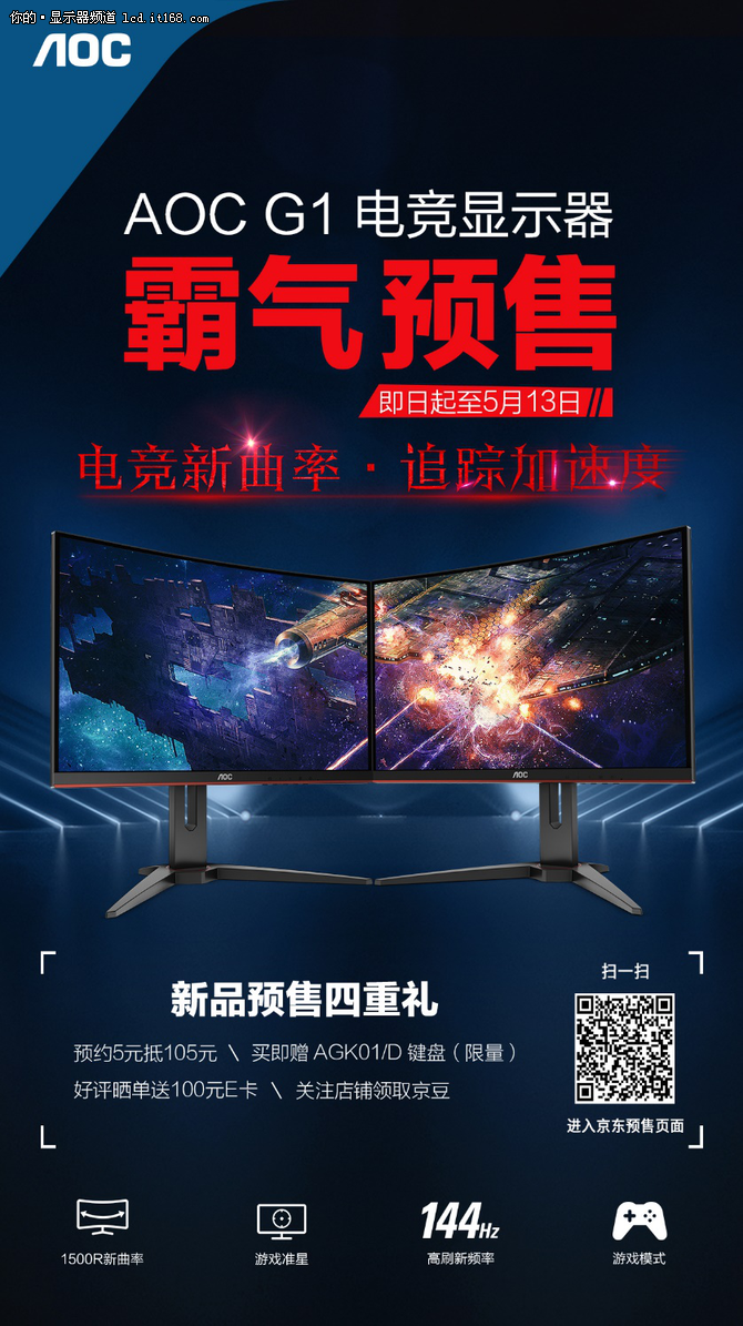 不外,本年AOC新出了两款电竞曲面屏显示器C24G1(23.6英寸MVA曲屏)和C27G1(27英寸MVA曲屏),那两款产物别离将曲率开创到了1350R(核心曲率)和1700R(核心曲率)的新低,别的还配备了144Hz电竞级的高刷新率等亮点,然而正在价钱方面却都节制正在了2000元以内。其外AOC C24G1仅需1499元,现正在正在京东采办还能享遭到1399元的预定价【京东商城促销页面】是不是很心动呢?先别感动,下面我们再来细致领会下那两款曲面显示器。