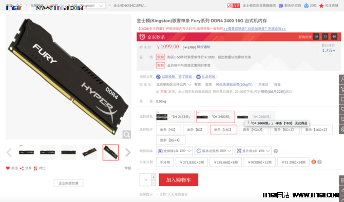 【IT168 行情】金士顿品牌一曲是泛博逛戏玩家的DIY配备首选,今天小编就给大师引见的是金士顿骇客神条Fury系列DDR4 2400 16G内存条,其超卓的机能和从动超频都是小编保举的次要来由,目前正在京东单条16G版本售价为1099元,无乐趣的话能够点击文末的链接进入采办页面。