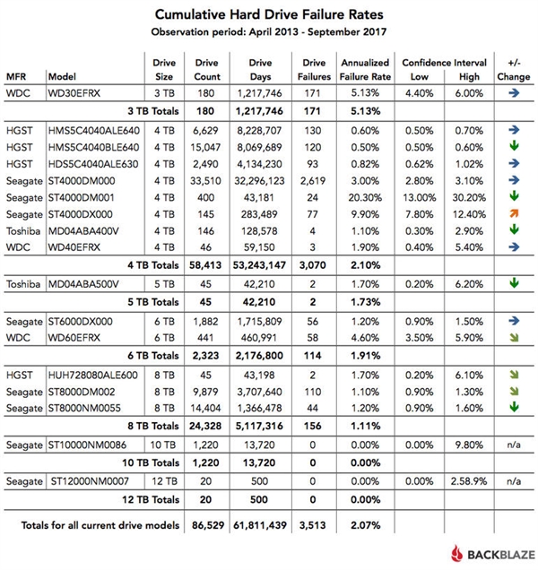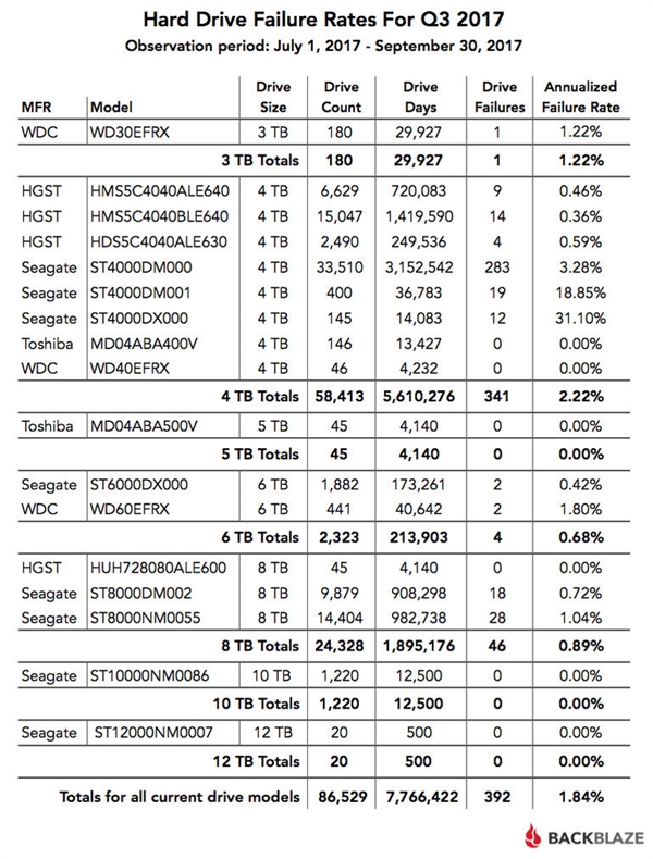 云备份服务商BackBlaze发布了2017年第三季度机械硬盘故障率报告,样本数量增加到86000块。