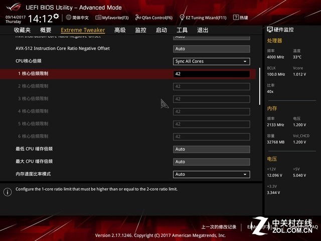 现在的新品处理器外频(一般是BCLK频率100MHz)基本上很难有太大动作,想要超频大都是直接调节倍频,将下方的“CPU核心倍频”选项从ByCoreUsage(根据负载调节)改为SyncAllCores(同步所有核心),然后就会出现下方的倍频设置,默认状态下是AUTO,可以根据经验来进行尝试,输入42,就代表CPU主频调节至了100*42=4200MHz=4.2GHz。当然要是想要极限超频还可以选择自主设置每个核心的频率。